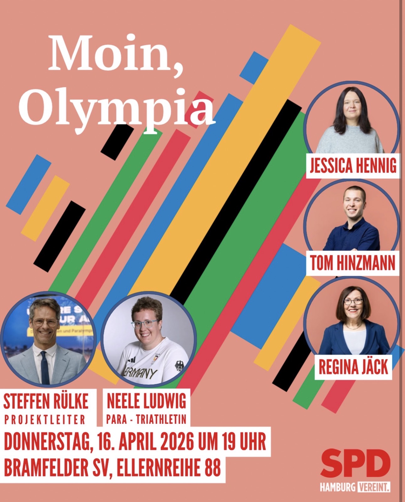 Der Austausch findet am Donnerstag, den 16. April 2026, um 19:00 Uhr im Vereinsheim des Bramfelder Sportvereins (Ellernreihe 88) statt. Im Mittelpunkt der Veranstaltung stehen die Chancen, Herausforderungen und möglichen Auswirkungen einer erneuten Olympiabewerbung für Hamburg. Neben einem Überblick über den aktuellen Stand der Planungen wird es Gelegenheit für Fragen und den Austausch mit den Anwesenden geben.